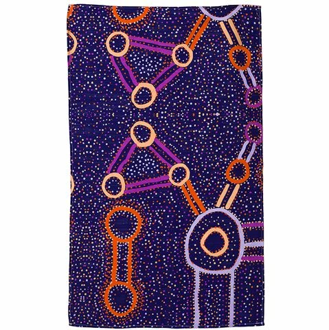 A tea towel is the next best thing to use after a canvas in order to display the beautiful artwork of Watson Jangala Robertson. His masterpiece Water Dreaming adorns this particular cotton tea towel, emblazoning it with colour and in turn brightening up your kitchen.