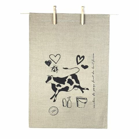 - Tea towel decorated with the sentence, “vaches du pays font du lait frais” (country cows make fresh milk).
