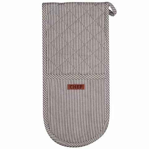 The Chef Stripe Double Oven Mitt Grey by Ogilvies Designs is made from 100% cotton, and features a beautiful grey and white stripe design. With the word Chef embossed on a faux leather piece on one side, you can now take over the kitchen and create so many delicious baked goodies!