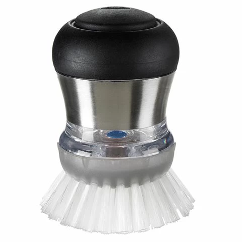 Simply press the soft top to release soap when you want it. Sturdy nylon bristles make scouring pots and scrubbing pans easier, and they’re safe for use on non-stick cookware. The soft, non-slip cap cushions your hand while you scrub, and a clear window shows you how much soap is left.