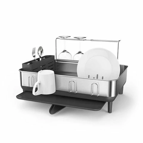 The Simplehuman Steel Frame Dishrack has a solid stainless-steel frame that matches the aesthetic of modern upscale kitchen appliances. It has a swivel spout that pivots so you can drain water directly into the sink, and it also can be removed for easy cleaning.The drip tray is angled and coated with a hydrophilic coating, so water drains quickly preventing residue build-up. The silicone-capped wire rack holds dishes tightly without scratching or chipping. The wine glass holder hangs up to 4 wine glasses — even those extra-large Bordeaux glasses. A fingerprint-proof coating helps protect against smudges.
